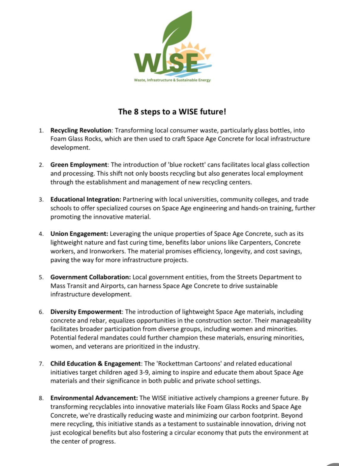However, the impact of Space Age Concrete extends far beyond its physical properties. It is at the forefront of a recycling revolution, one that is purpose-driven and resonates with the acronym WISE - Waste, Infrastructure & Sustainable Energy. This concept heralds a new era in our approach to environmental stewardship, emphasizing the importance of repurposing waste for the betterment of our infrastructure and energy sustainability.